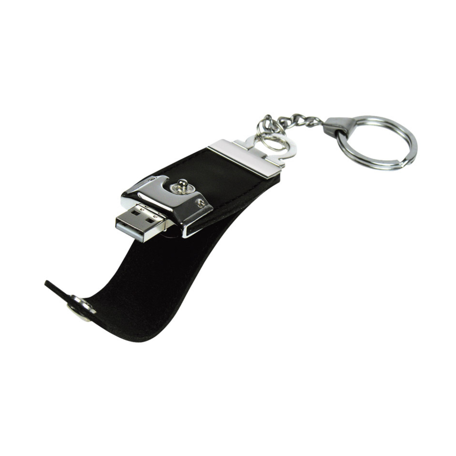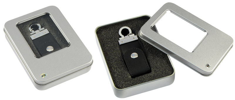 Llavero metálico con USB Pendrive ejecutivo de simil cuero negro de 4 GB de capacidad. Presentación en caja metálica con ventana.